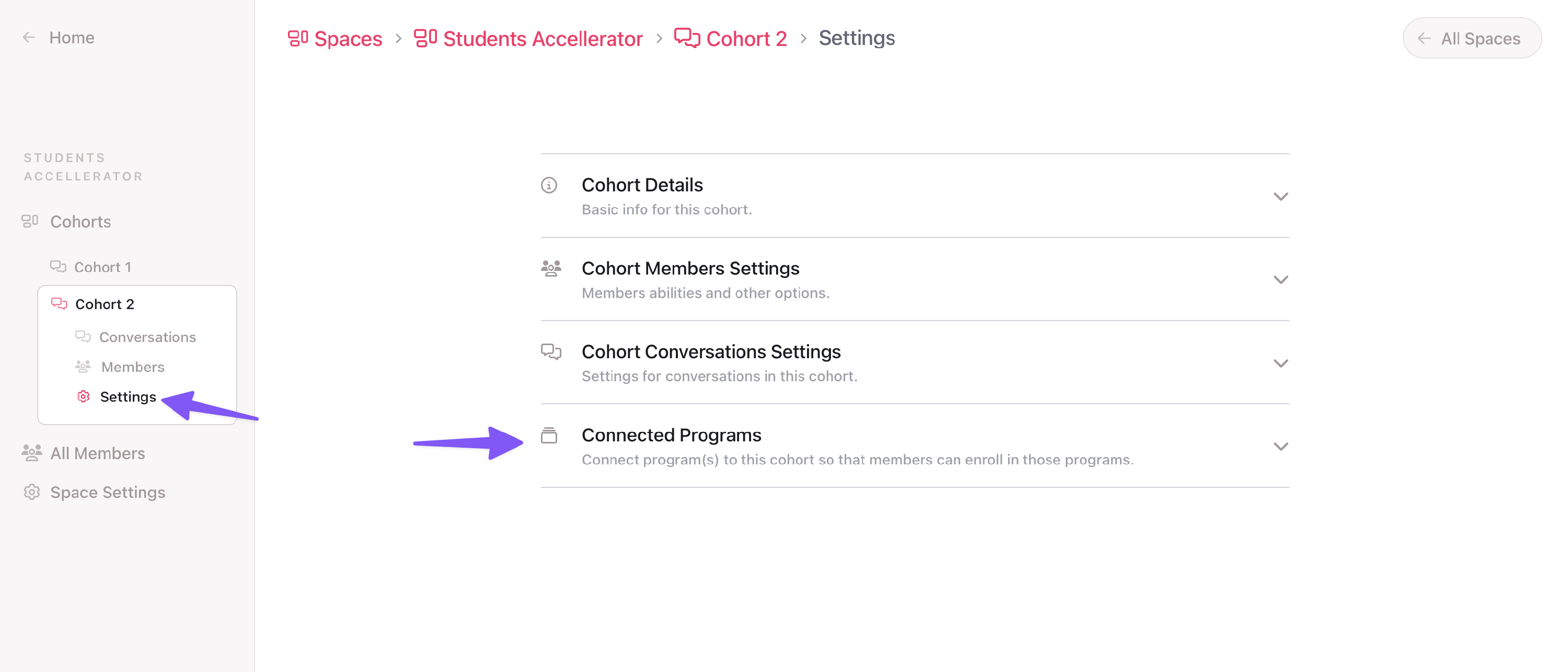 When configuring the settings for a cohort within a group (Group > Cohorts > View a Cohort > Cohort Settings > Connected Courses)