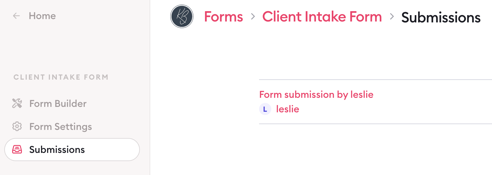 1. Navigate to "Forms" in the left-side menu, select "Submissions," and then select which form's submissions you want to see (e.g. your client intake form).