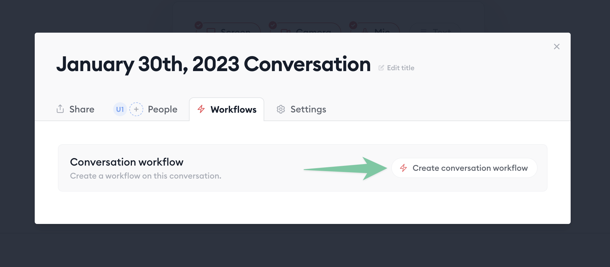 On a conversation: A workflow on the conversation level can be triggered by things that happen throughout the conversation. For example, you can run a workflow on a conversation that's triggered anytime a new message is posted to this conversation. Or run a workflow based on the time this conversation was created.
