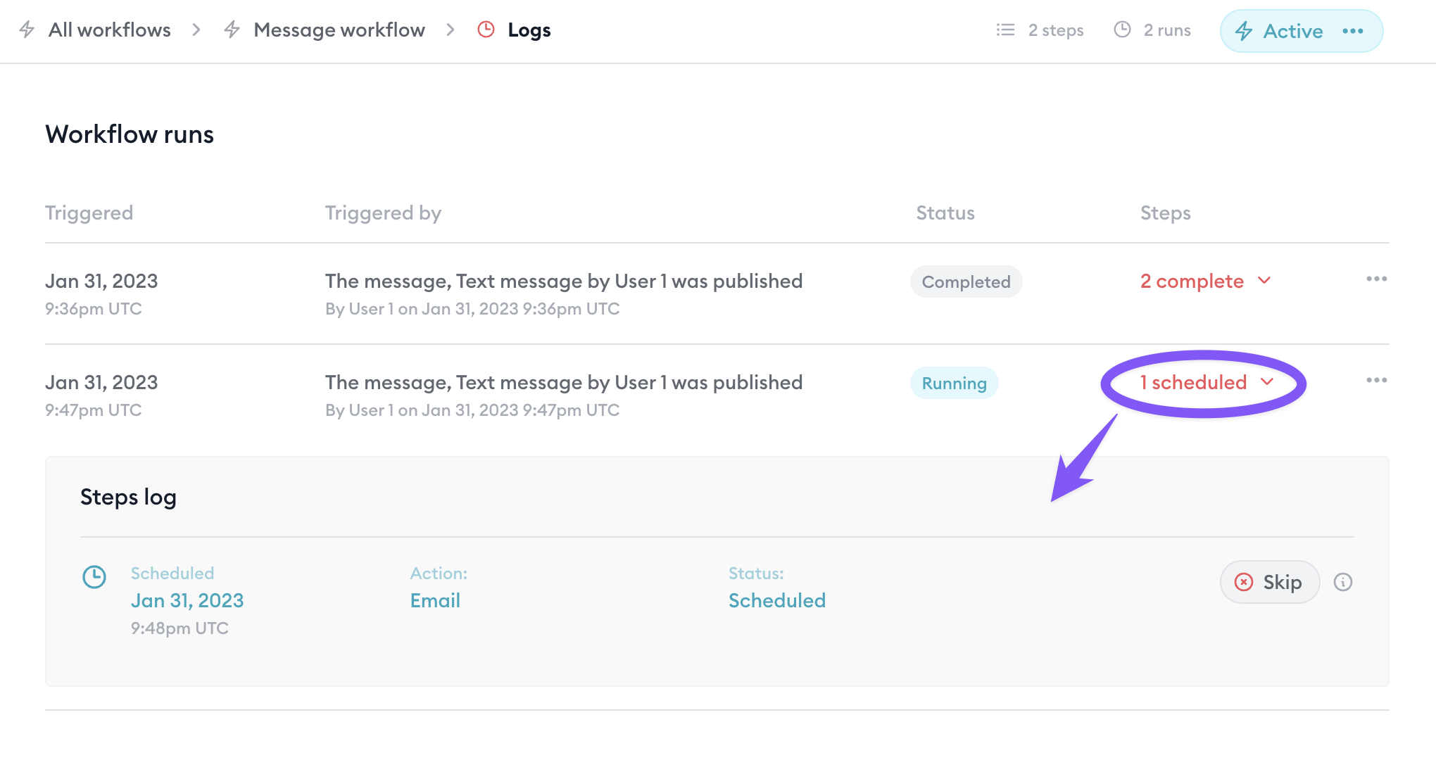 Note: If at the time a step is scheduled to run the workflow is paused, then this step will be marked as "skipped" and will not perform its action. The next step will still be scheduled to run and its delay time will still be calculated starting from the time the "skipped" step would have run. That next step will run as long as the workflow is in an "active" step when its run time arrives.