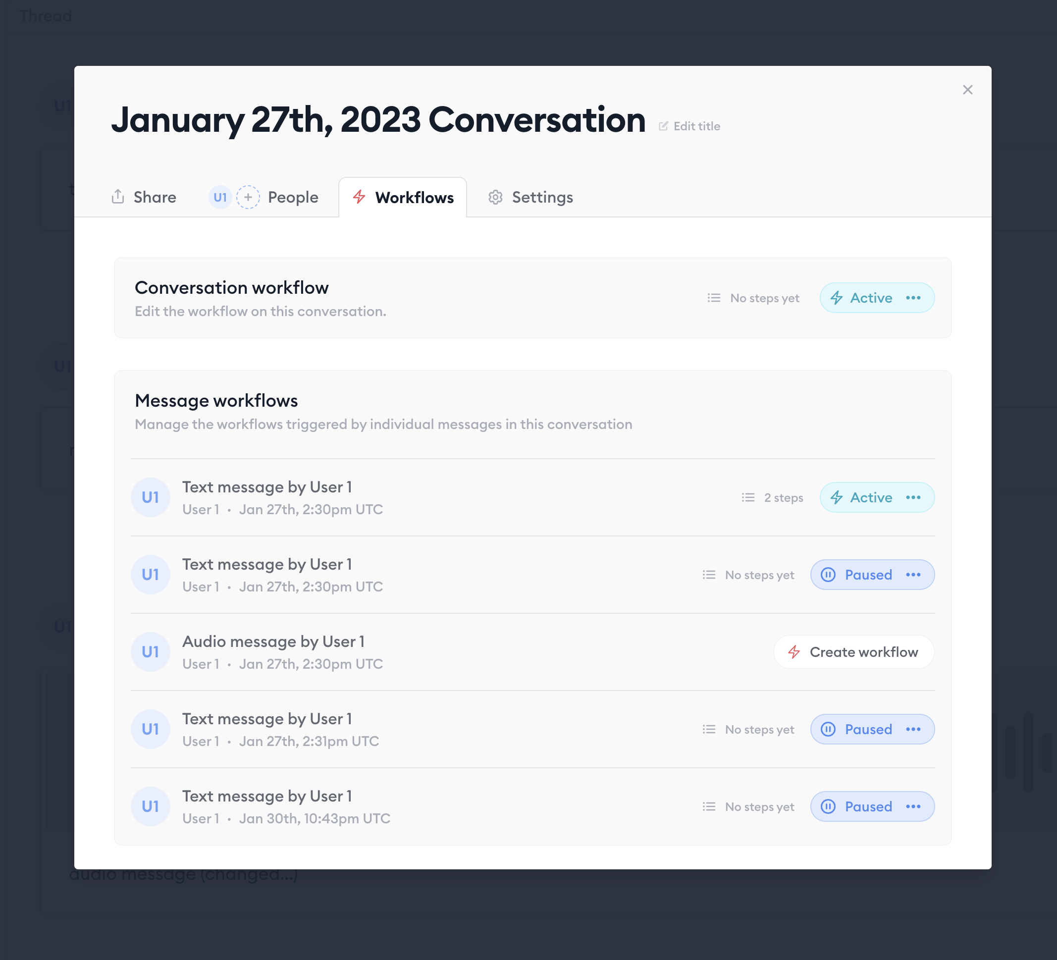 On a message within a conversation: You can also create workflows on any of the individual messages within a conversation. This is useful when you want to trigger things based on one specific message. For example, you can run a workflow on a message that's triggered when someone presses play on this specific message's video or when someone has posted a threaded reply under this specific message.
