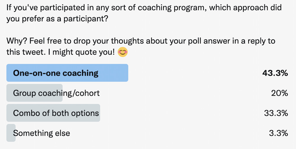 In one Twitter poll we conducted, nearly 44% of respondents said one-on-one is their favorite approach as a coaching client — above group coaching or a combination of group coaching and one-on-one sessions.